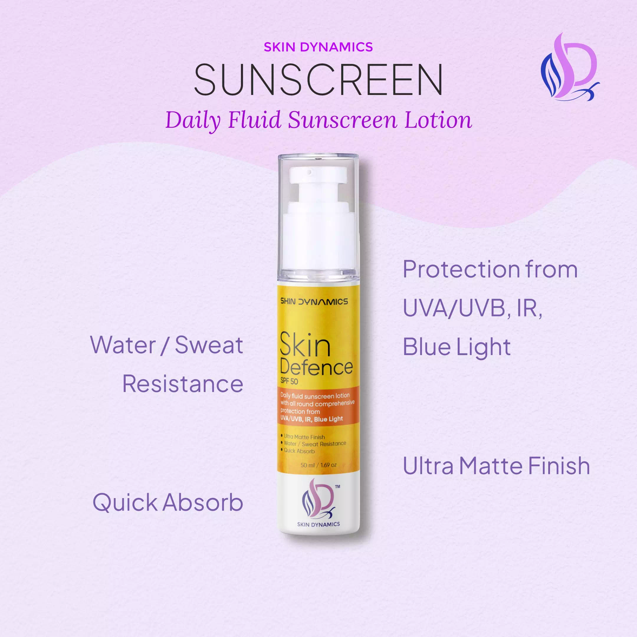 Skin Defence SPF 50 Daily Fluid Sunscreen Lotion with all round comprehensive protection from UVA/UVB, IR, Blue Light