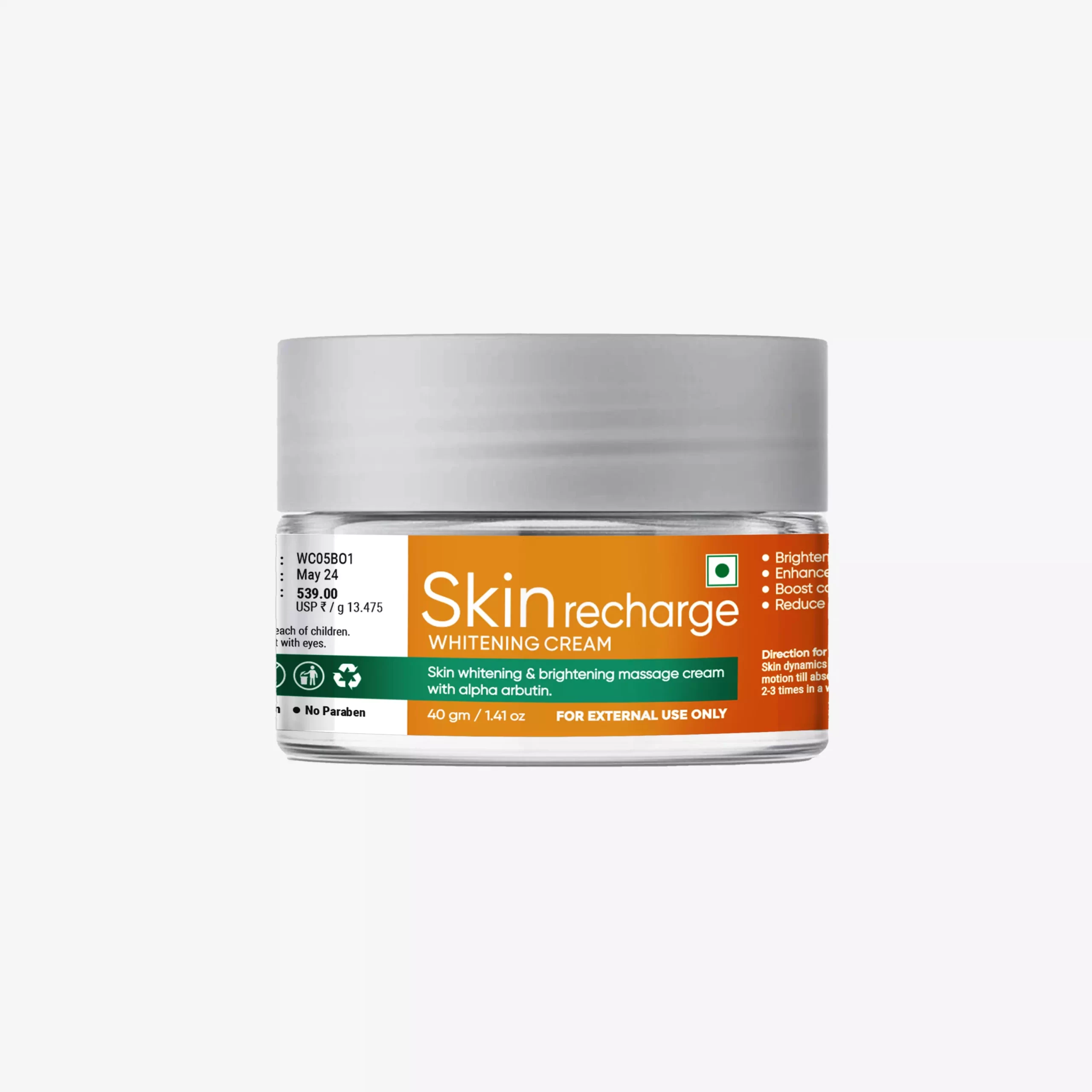 Skin Recharge Whitening & Brightening Massage Cream with alpha arbutin.
